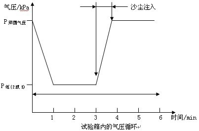 試驗(yàn)用塵:試驗(yàn)用塵是干燥的非磨蝕性的細(xì)粉塵,能夠通過篩孔為75µm,金屬絲直徑為50µm的平面網(wǎng)狀篩。本試驗(yàn)中可以使用滑石粉,分析表明它可以滿足要求。試驗(yàn)用塵使用次數(shù)不應(yīng)超過20次。應(yīng)注意維持干燥以保持粉塵細(xì)度,使用前應(yīng)在80℃下烘干2h. 塵濃度:試驗(yàn)用塵的數(shù)量應(yīng)能夠使箱底基準(zhǔn)表面上的沉降量均勻維持在(600±200)µ/(m²•h)。 氣流:試驗(yàn)箱內(nèi)的氣流應(yīng)主要是自上而下的垂直氣流,而非層流。 氣流速度:氣流速度應(yīng)能夠使塵在試驗(yàn)箱內(nèi)均勻分布。 濕度:試驗(yàn)箱內(nèi)的相對濕度應(yīng)小于15%?梢酝ㄟ^提高試驗(yàn)箱濕度實(shí)現(xiàn)。 樣品內(nèi)氣壓:根據(jù)樣品的運(yùn)行條件,樣品外殼可以分為兩種類型: 類型1:樣品外殼內(nèi)的氣壓可能會與外界大氣壓不同,例如由運(yùn)行中的熱力循環(huán)引起氣壓不同。 類型2:樣品外殼內(nèi)的氣壓跟外界氣壓相同。 相關(guān)規(guī)范應(yīng)闡明樣品外殼類型和壓力降。 砂塵試驗(yàn)箱對于具有類型1外殼的樣品,應(yīng)放入試驗(yàn)箱,并按照正常使用位置安裝。樣品應(yīng)承受圖中規(guī)定的壓降周期。根據(jù)相關(guān)規(guī)范中規(guī)定,壓力降應(yīng)為2kPa(20mbar)或5kPa(50mbar) 。 如圖所示,塵應(yīng)在每個(gè)循環(huán)周期內(nèi)注入。 對于具有類型2外殼的樣品,應(yīng)放入試驗(yàn)箱,并按照正常使用位置安裝。此種情況下,不應(yīng)使用真空泵。