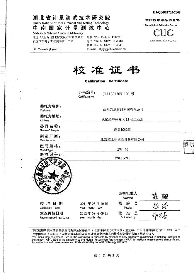 >>高溫試驗箱校準(zhǔn)證書-湖北計量院-邦迪集團(tuán)