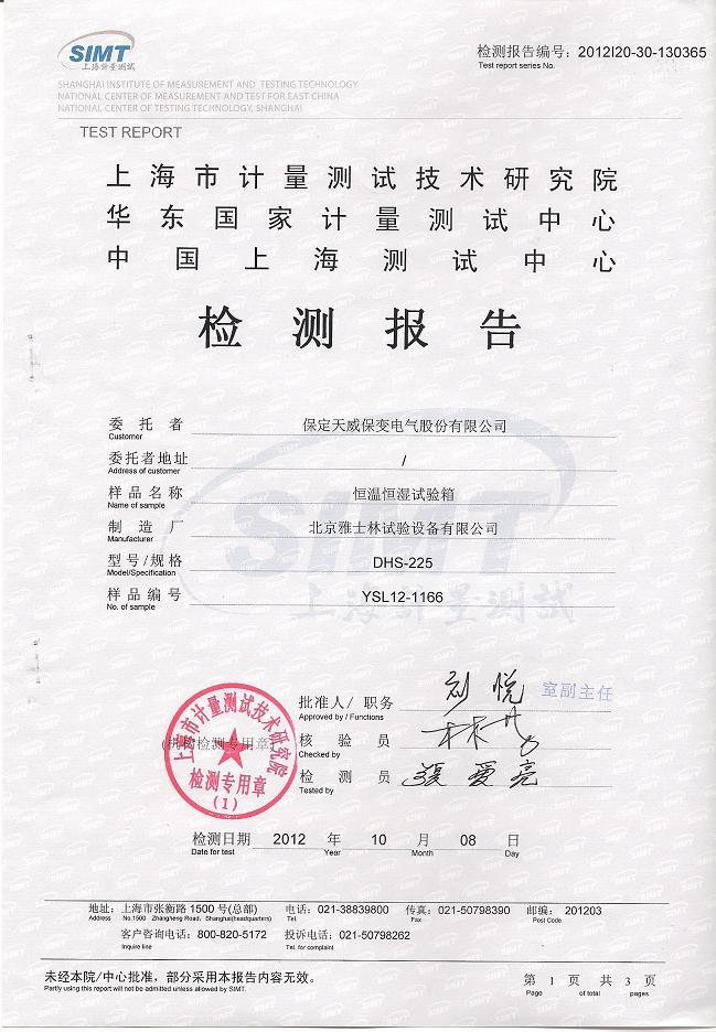恒溫恒濕試驗(yàn)箱檢測報告-上海計(jì)量院-天威保變
