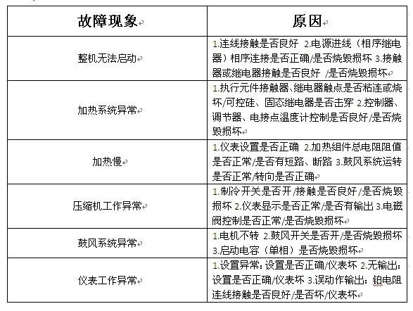 很多人可能會對高低溫試驗箱偶爾出現(xiàn)的異常狀況弄的一頭霧水,下面就有請專業(yè)技術(shù)工程師為我們講解高低溫試驗箱出現(xiàn)異常狀況時我們應(yīng)該怎么處理,下面的一張表讓你明明白白,大家可簡單的對號入座。